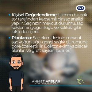 Elde edilen sayı ile saç ekimi yapılacak alan için doğru planlama yapılır. Bu aşamada önemli noktalardan biride ön hat çizgisidir. Saça doğal görünümü vercek olan bu çizgi kişinin beklentisine greft sayısına bağlı kalarak yapılır.